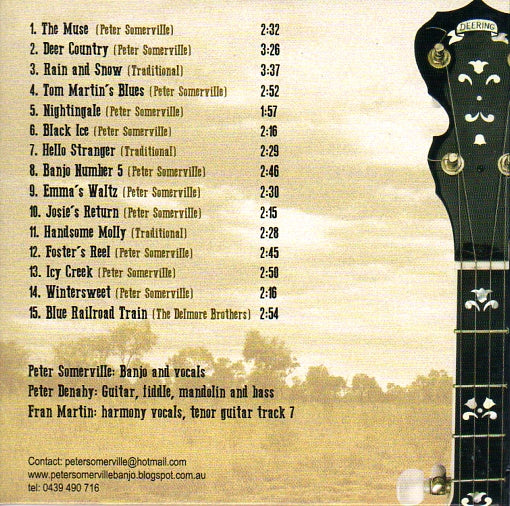 RELEASED IN 2013 THIS ALBUM IS A COLLECTION OF ELEVEN ORIGINAL INSTRUMENTAL TUNES WRITTEN BY PETER SOMERVILLE OF "THE BURNING BRIDGES" FAME AND FOUR TRADITIONAL SONGS. PRAISED BY BLUEGRASS UNLIMITED: "MANY TUNES ARE ORIGINALS BUT HAVE THAT FAMILIARITY THAT MAKES ONE COMFORTABLE WITH THEN RIGHT OFF. ALL IN ALL, AN ENJOYABLE LISTEN AND AN INTERESTING LOOK INTO WHAT IS GOING ON DOWN UNDER." ARTISTS FEATURED ON THIS RELEASE: PETER DENAHY (GUITAR, FIDDLE, BASS), PETER SOMERVILLE (CLAWHAMMER AND 3 FINGER STYLE BANJO, LEAD VOCALS), FRAN MARTIN (HARMONY VOCALS) GREAT OLD-TIMEY & BLUEGRASS *****