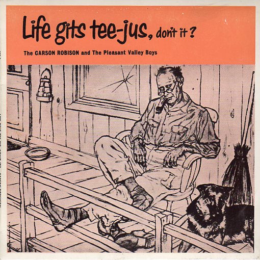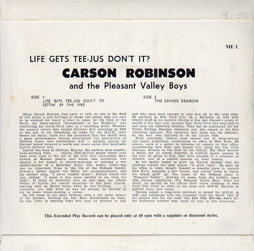 CARSON ROBISON (NOT ROBINSON AS SHOWN ON THE RECORD AND REAR OF THE SLEEVE) BEGAN HIS RECORDING CAREER IN 1924 WITH VICTOR RECORDS. FROM RECORDING CARSON SOON SPREAD OUT TO SONG-WRITING AND MUSIC PUBLISHING ESTABLISHING AN OFFICE IN NEW YORK. HE ALWAYS MADE IT A POLICY TO WELCOME ALL COMERS TO THAT OFFICE, REMEMBERING HOW FOLKS HAD HELPED HIM ALONG THE WAY. CARSON ENTERTAINED TWO GENERATIONS OF HILLBILLY MUSIC FANS WONDERFULLY WELL - MILLIONS DURING HIS LIFETIME LOOKED FORWARD TO WORDS AND MUSIC STYLED THAT INIMITABLE CARSON ROBISON WAY. CARSON SIGNED A LONG-TERM CONTRACT WITH M.G.M. IN 1947 AND CONTINUED TO RECORD FOR THE LABEL UNTIL HIS DEATH. ONE OF HIS BIGGEST HITS FOR THE LABEL WAS "LIFE GITS TEE-JUS, DON'T IT?", THE HUMOROUS NUMBER THAT LENDS ITS TITLE TO THIS RELEASE.