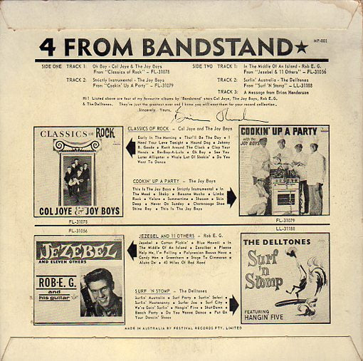 AUSTRALIAN BANDSTAND, WHILST NOT RELATED TO AMERICAN BANDSTAND WAS BASED ON THE SAME CONCEPT. THE PROGRAM RAN FROM 1958 TO 1972 AND IT WAS HOSTED BY SYDNEY NEWS READER BRIAN HENDERSON FOR IT'S ENTIRE TENURE AND FEATURED AUSTRALIAN ARTISTS OF THE DAY ALONG WITH INTERNATIONAL ARTISTS. FOR MOST OF US FANS IT WAS THE ONLY OPPORTUNITY TO SEE THE ARTISTS WE WERE HEARING ON THE FEW RADIO STATIONS THAT PLAYED ROCK'N'ROLL MUSIC. THIS FIVE TRACK EXTENDED PLAY RELEASED IN 1963 FEATURES TRACKS BY FOUR OF THE ARTISTS THAT APPEARED ON THE SHOW LIFTED FROM THEIR ALBUM RELEASES. THE FIFTH TRACK IS A MESSAGE FROM THE SHOW'S HOST, BRIAN HENDERSON. THE SLEEVE IS IN VERY GOOD CONDITION WITH ONLY MINOR SOILING AND WEAR ALONG THE EDGES AND THE RECORD IS IN NEAR MINT CONDITION.