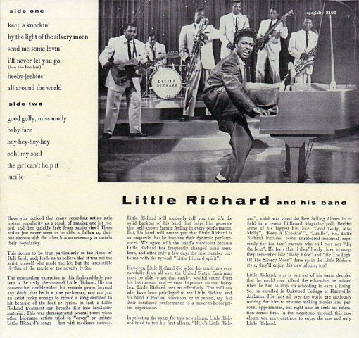 TRACK LISTING: Side 1 - Keep A Knockin' / By The Light Of The Silvery Moon / Send Me Some Lovin' / I'll Never Let You Go (Boo Hoo Hoo Hoo) / Heeby-Jeebies / All Around The World. Side 2 - Good Golly Miss Molly / Baby Face / Hey-Hey-Hey-Hey / Ooh! My Soul / The Girl Can't Help It / Lucille.