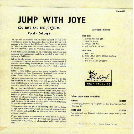 Cat. No. VV 1087: COL JOYE AND THE JOY BOYS ~ JUMP WITH JOYE. FESTIVAL FM-6010.