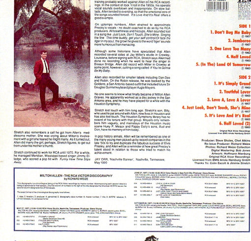 JIMMIE SHOT 150 TO 200 FEET OF FILM OF MILTON AND SENT IT TO STEVE SHOLES HEAD OF RCA'S COUNTRY AND SPECIALTY DIVISION ALONG WITH AN 8X10 PHOTO AND SOME INFORMATION. SHOLES LIKED WHAT HE SAW AND ARRANGED FOR MILTON TO RECORD SOME DEMOS OF SONGS THAT ELVIS PRESLEY HAD RECORDED BECAUSE MILTON DID EVERYTHING LIKE ELVIS. SHOLES LIKED WHAT HE HEARD AND MILTON WAS DULY SIGNED BY RCA IN THE HOPE THAT THEY HAD ANOTHER ELVIS PRESLEY. MILTON'S FIRST RECORD. "JUST LOOK , DON'T TOUCH , SHE'S MINE", WHILST RECEIVING GOOD REVIEWS, FAILED TO CREATE A STIR IN AIRPLAY. HIS FOLLOW UP "DON'T BUG ME BABY" ALSO FAILED AND RCA VOIDED HIS CONTRACT FOLLOWING MILTON'S MOTHER'S REQUEST TO DO SO. IN POP HISTORY ANNALS MILTON ALLEN WILL BE REMEMBERED AS ONE OF THE MANY YOUNG MEN PICKED UP BY RECORD COMPANIES IN SEARCH OF ANOTHER ELVIS PRESLEY.