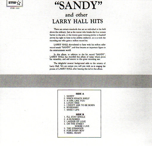 LARRY HALL (BORN LAWRENCE KENDALL HALL) IS MOSTLY KNOWN IN ROCK'N'ROLL CIRCLES FOR HIS 1959 ONE-HIT WONDER SONG, "SANDY", ON THE EVER GREEN LABEL WHICH ALSO APPEARED ON THE HOT RECORDS LABEL AS WELL AS THE STRAND LABEL THE DISC REACHED #15 ON THE BILLBOARD HOT 100 CHART AND #6 IN CANADA.