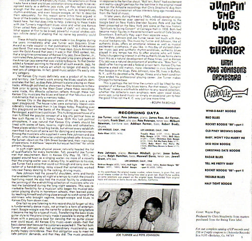 THE RECORDINGS ENSHRINED IN THIS ALBUM WERE MADE IN LOS ANGELES DURING THE YEARS IMMEDIATELY AFTER JOE TURNER WON ESQUIRE'S SILVER AWARD AS MALE VOCALIST IN THAT PUBLICATION'S 1945 ALL-AMERICAN JAZZ BAND. IT WAS IN THAT 1945 CONTEST, TOO, THAT A LONG-TIME CONNOISSEUR OF KANSAS CITY JAZZ, DAVE DEXTER, JR. NOMINATED PETE JOHNSON AS ONE OF THE YEAR'S TOP PIANO PLAYERS ON THE AMERICAN JAZZ SCENE THAT WAS VISIBLE TO ESQUIRE.