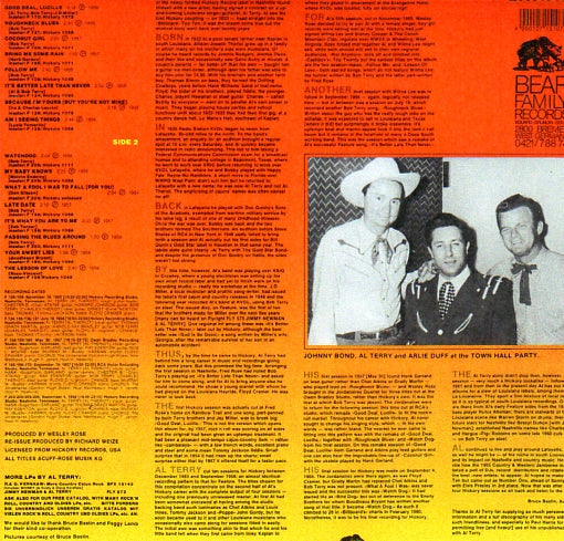 AL AND HIS BROTHER, BOBBY, FORMED A NEW BAND CALL THE SOUTHERNERS AND RECORDED 10 DISCS FOR A FLEDGLING RECORD LABEL, FEATURE, FORMED BY THE LEGENDARY J. D. MILLER AND THEY SCORED A REGIONAL HIT WITH "IT'S BETTER LATE THAN NEVER" WHICH HE LATER RECUT FOR HICKORY. AL RECORDED TEN SESSIONS FOR HICKORY BETWEEN DECEMBER 1953 AND SEPTEMBER 1958 AND THE TITLES CHOSEN FOR THIS ALBUM CONCENTRATE ON THE SECOND HALF OF AL'S TENURE WITH HICKORY AND FEATURE SOME GREAT HILLBILLY ALONG WITH ROCKABILLY BOPPERS SUCH AS "WATCHDOG". THE SLEEVE IS IN EXCELLENT CONDITION WITH ONLY VERY MINOR SIGNS OF WEAR. THE RECORD IS GRADED AS NEAR MINT.