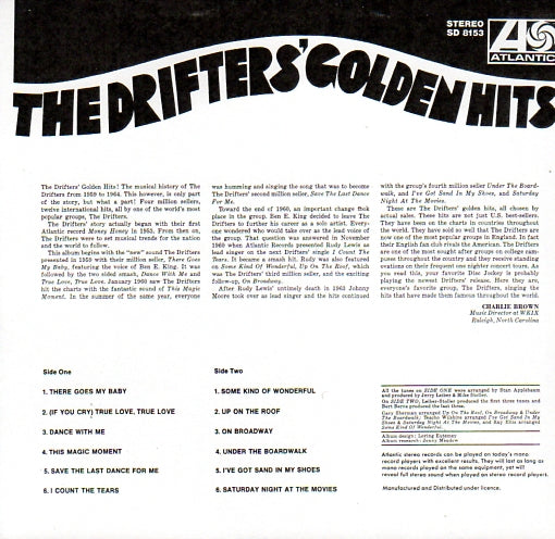 TOWARD THE END OF 1960, BEN E. KING LEFT THE GROUP TO FOLLOW A SOLO CAREER AND WAS REPLACED BY RUDY LEWIS AND THE HITS KEPT ON COMING INCLUDING THE GROUP'S THIRD MILLION SELLER, "UP ON THE ROOF". FOLLOWING RUDY'S UNTIMELY DEATH IN 1963 LEAD VOCAL DUTIES WENT TO JOHNNY MOORE AND STILL THE HITS CONTINUED WITH THE GROUP'S FOURTH MILLION SELLER "UNDER THE BOARDWALK" ALONG WITH "I'VE GOT SAND IN MY SHOES" AND "SATURDAY NIGHT AT THE MOVIES. THIS ALBUM IS TRULY TITLED - "THE DRIFTERS' GOLDEN HITS".