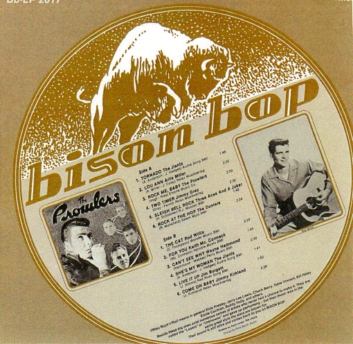 BISON BOP WAS A GERMAN SUB-LABEL OF THE GERMAN PARENT COMPANY DEE JAY SCHALLPLATTEN GMBH DEDICATED TO AMERICAN ROCKABILLY AND ROOT-INFLUENCED ROCK'N'ROLL OF THE 1950s AND EARLY 1960s. A TOTAL OF 38 COMPILATION LPs WERE RELEASED ON BISON BOP BETWEEN 1979-1985. THESE RELEASES WERE TRANSITIONED OVER TO ANOTHER OF THE PARENT COMPANY'S SUB-LABELS, BUFFALO BOP, DURING THE 1985 RELEASE YEAR WHERE THEY WERE SUBSEQUENTLY RELEASED ON CD. THE IDENTICALLY THEMED SERIES CONTINUED UNTIL 1992 WITH A SINGLE ADDITIONAL LP...VOLUME 65...RELEASED IN 2001. ALTHOUGH ALL TRACKS IN THIS SERIES LATER APPEARED IN THE BUFFALO BOP RELEASES THIS VINYL SERIES IS A VERY HIGHLY COLLECTABLE SERIES BY VINYL AFICIONADOS.