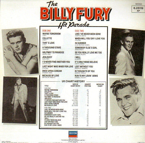 BILLY FURY (BORN RONALD WYCHERLEY) WAS AN EARLY STAR OF THE BRITISH ROCK AND ROLL SCENE. HE FIRST RECORD IN 1959, "MAYBE TOMORROW", PROVED TO BE A MINOR HIT REACHING NUMBER 22 ON THE BRITISH CHARTS AND STAYED THERE FOR THREE WEEKS. HIS FOLLOW-UP RELEASE "COLLETTE" ACHIEVED A FAR BETTER RESULT REACHING NUMBER 2 AND REMAINED ON THE CHARTS FOR TEN WEEKS. ALL TOLD BILLY SPENT 332 WEEKS ON THE UK SINGLES CHARTS ALTHOUGH HE NEVER ACHIEVED A NUMBER 1 HIT. HIS HITS INCLUDED "WONDROUS PLACE", "HALFWAY TO PARADISE" AND "JEALOUSLY". BILLY ALSO MAINTAINED A FILM CAREER, NOTABLY PLAYING ROCK PERFORMERS IN PLAY IT COOL IN 1962 AND THAT'LL BE THE DAY IN 1973. AFTER RETURNING FROM A RECORDING SESSION IN THE EARLY HOURS OF 28TH JANUARY, 1983, BILLY COLLAPSED FROM A HEART ATTACK AND DIED THE FOLLOWING DAY. RHEUMATIC FEVER WHICH HE FIRST CONTRACTED AS A CHILD, DAMAGED HIS HEART AND ULTIMATELY CONTRIBUTED TO HIS DEATH. THIS COMPILATION ALBUM RELEASED IN 1982 BY DECCA RECORDS CONTAINS TITLES ALL PREVIOUSLY ISSUED BETWEEN 1959 AND 1965.